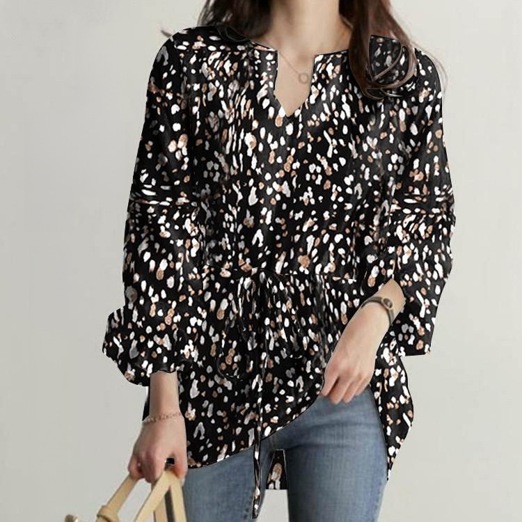 ヨーロッパとアメリカのゆったりとした豹柄プリントシャツ長袖トップス秋の女性用Vネックカジュアルフルスリーブシャツ